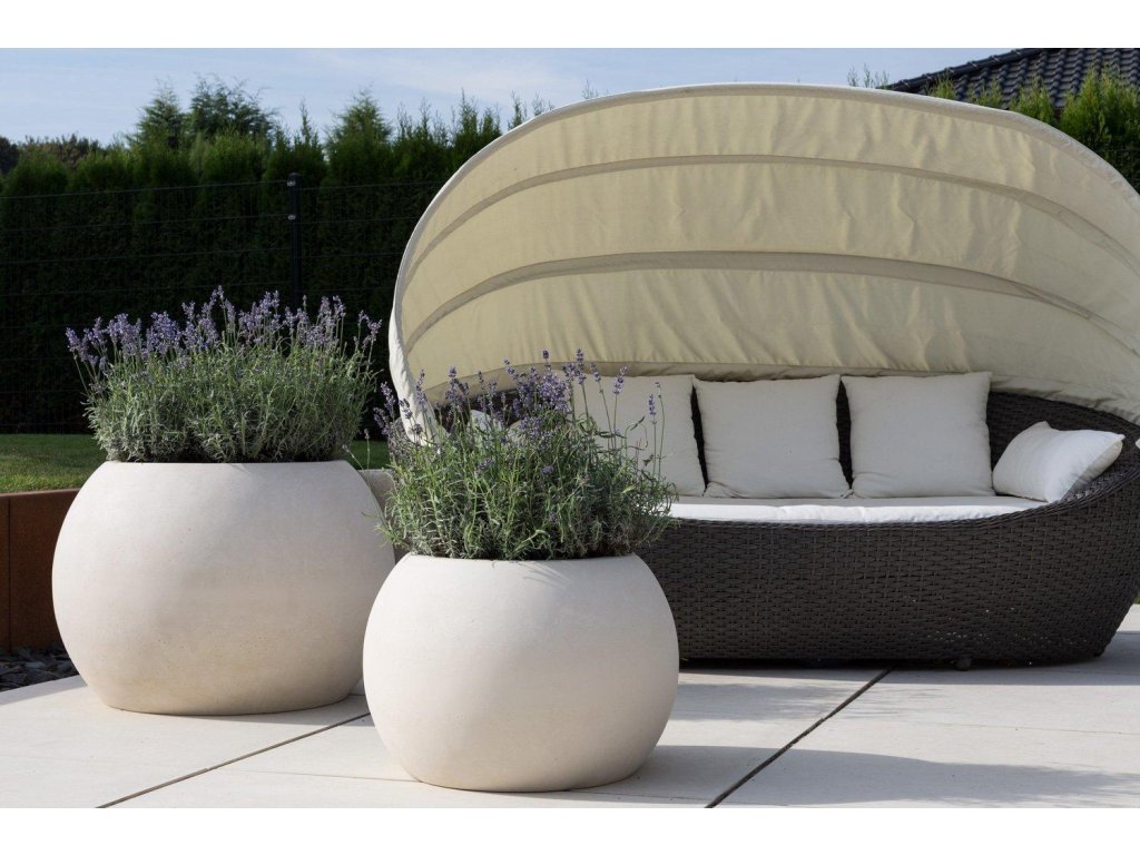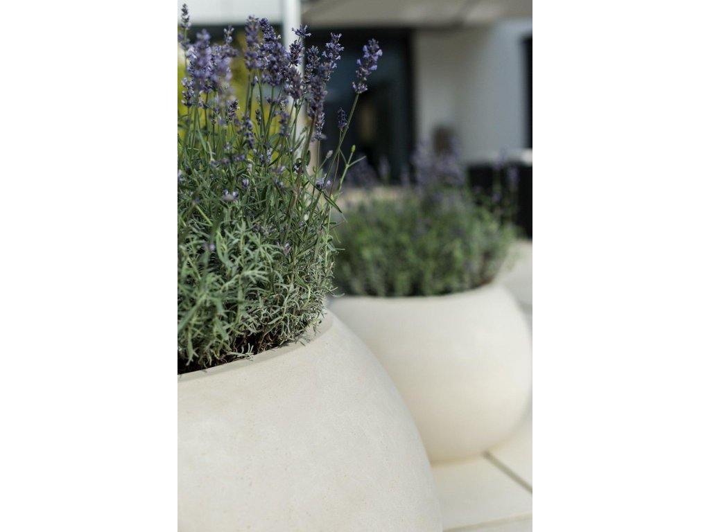 Príjemne zaobelené tvary XXL kvetináčov POLYSTONE GLOBE skvelo vyniknú predovšetkým na priestranných terasách.
