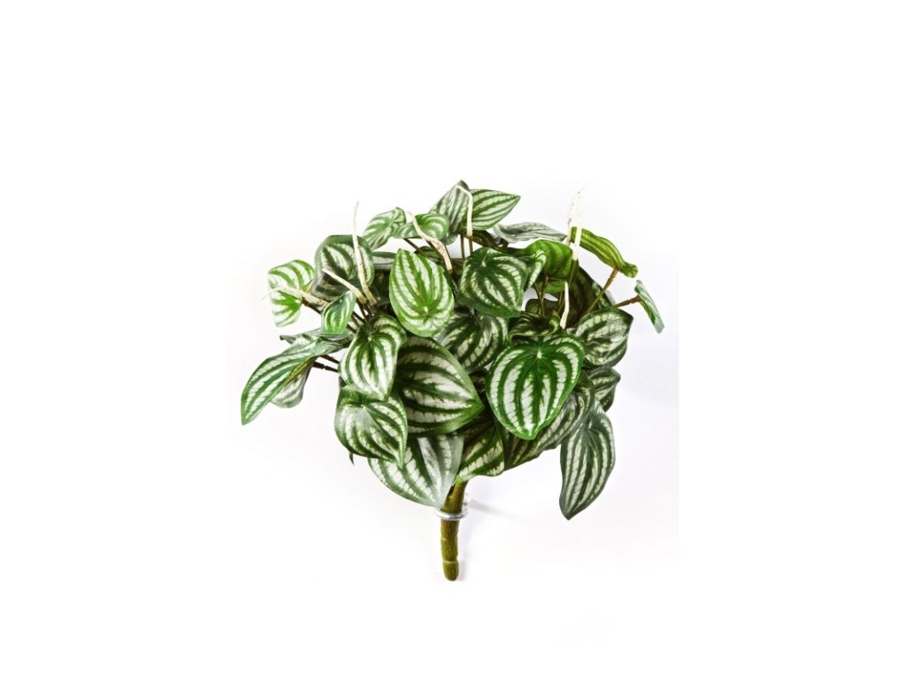 Tento umelý krík je inšpirovaný obľúbenou Peperomiou, známou ako „melónová peperómia“ vďaka unikátnemu vzoru na listoch. Strieborné a tmavozelené pruhy vytvárajú kontrast, ktorý pôsobí veľmi dekoratívne a osviežujúco. S celkovou výškou 25 cm je tento zápich perfektným riešením pre detailné dekorovanie.
