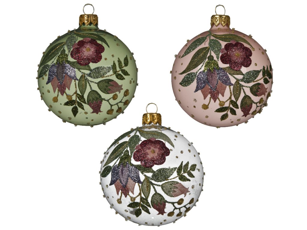Vianočná guľa zo skla s motívom rozprávkových trblietavých kvietkov je dostupná v troch prevedeniach.