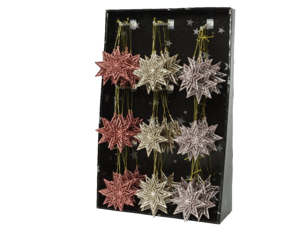 Plastové hviezdičky na vianočný stromček. Hviezdy sú dostupné v troch farebných prevedeniach. Cena je uvádzaná za jeden kus.
